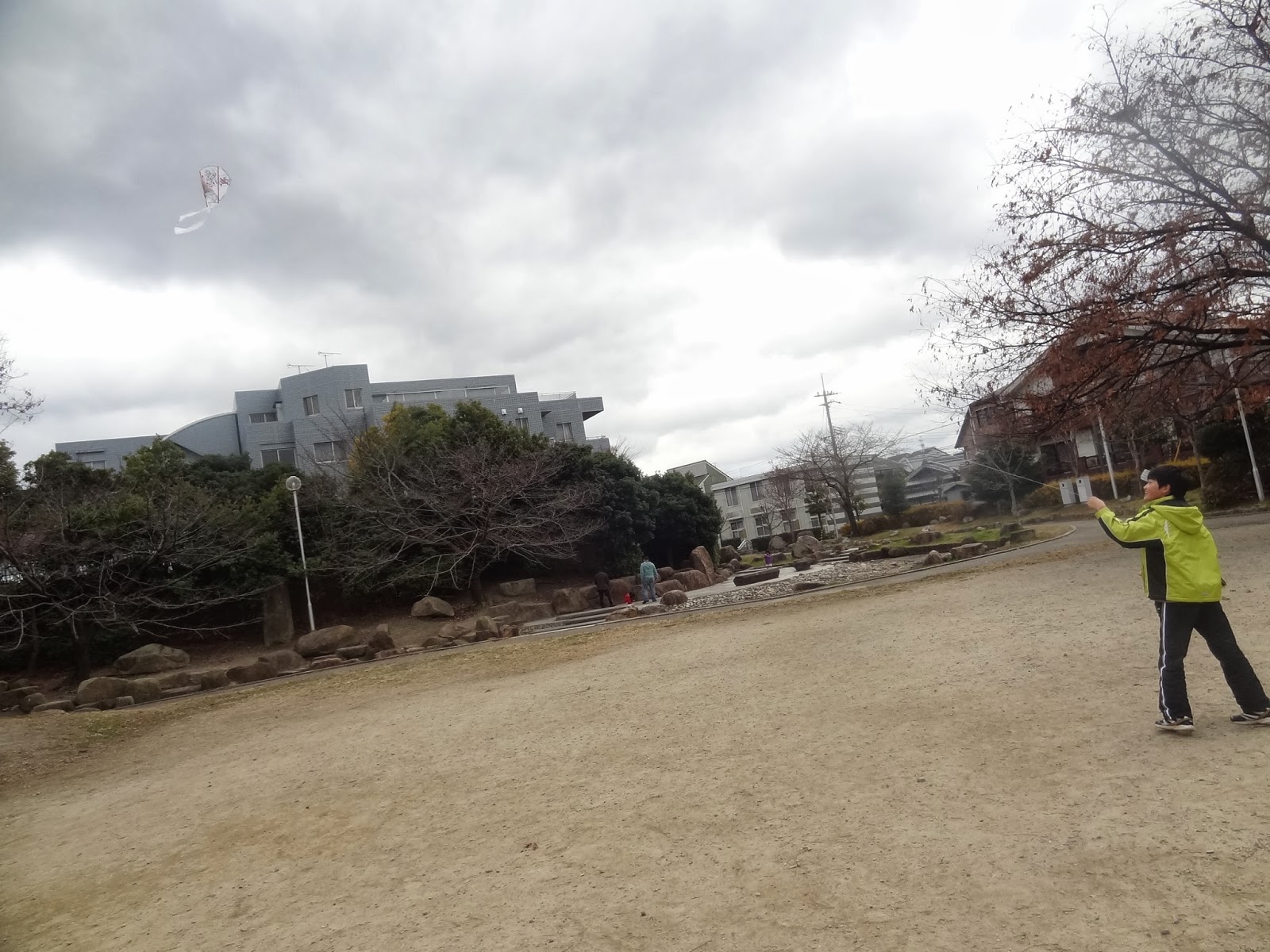 凧揚げをしに、久保公園へ。初めて来ましたが、割と広くて遊具もあり、楽しいです。