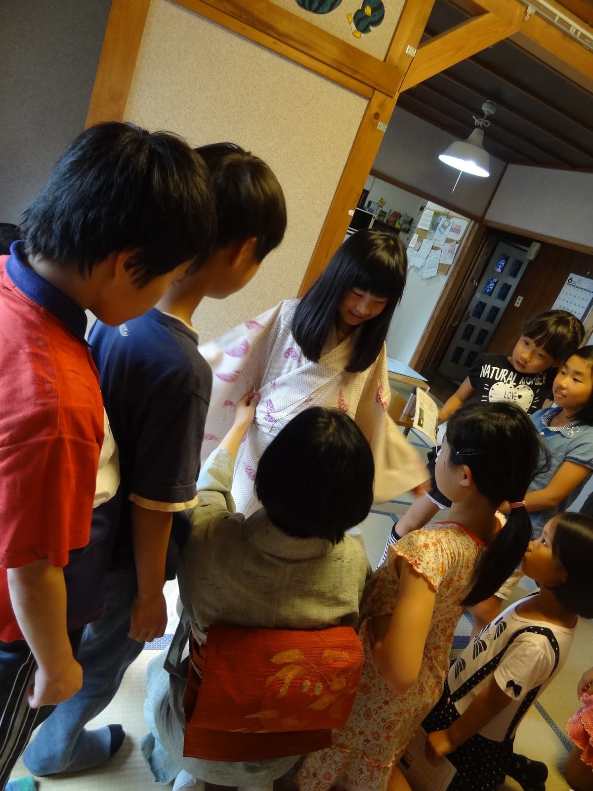 着物の柄に関するクイズのあと、子どもたちに着物を羽織る体験をさせてくれました。