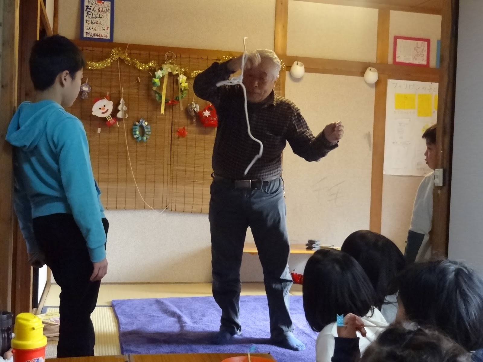 その他、安全ピンなど身の回りの物を使った手品も見せてくださり、縄や道具はお土産として子供たちにプレゼントしてくれました。