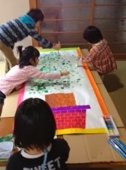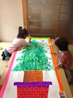 あらかじめ用意しておいた模造紙にスポンジタンポでポンポンとツリーの葉っぱを描いていきます。