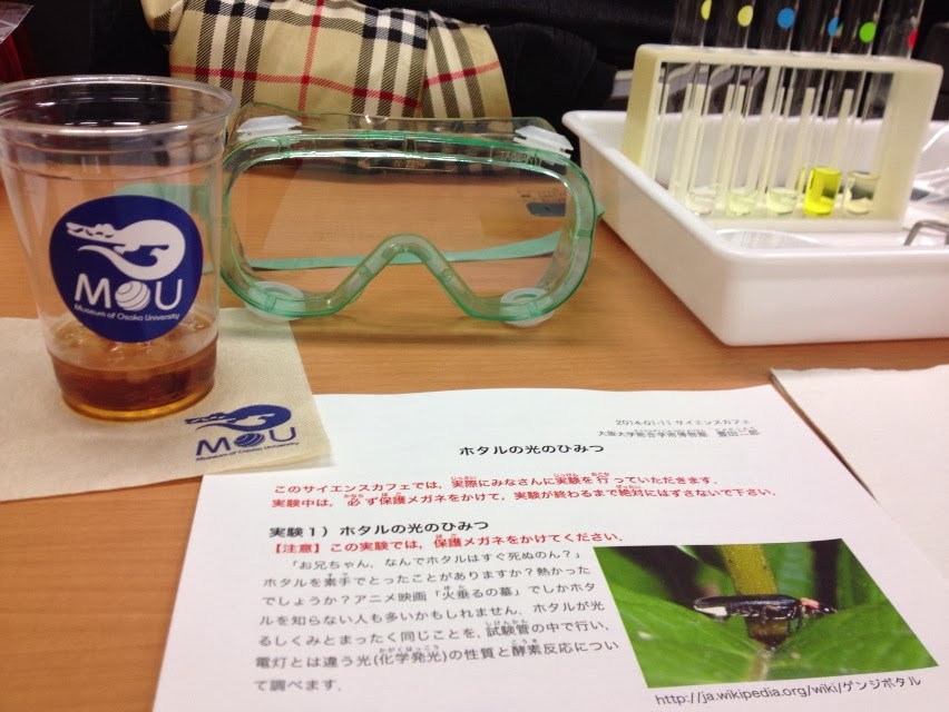 この日のテーマは『ホタルの光のひみつ』。中高生以上という年齢制限がつくテーマが多い中、この日は小学生でも参加が可能で、テーブルには一人1セット、試験管やらシャーレやら懐かしい実験道具から、保護メガネなど本格的な道具がずらり。科学オンチの私でもワクワクしました。