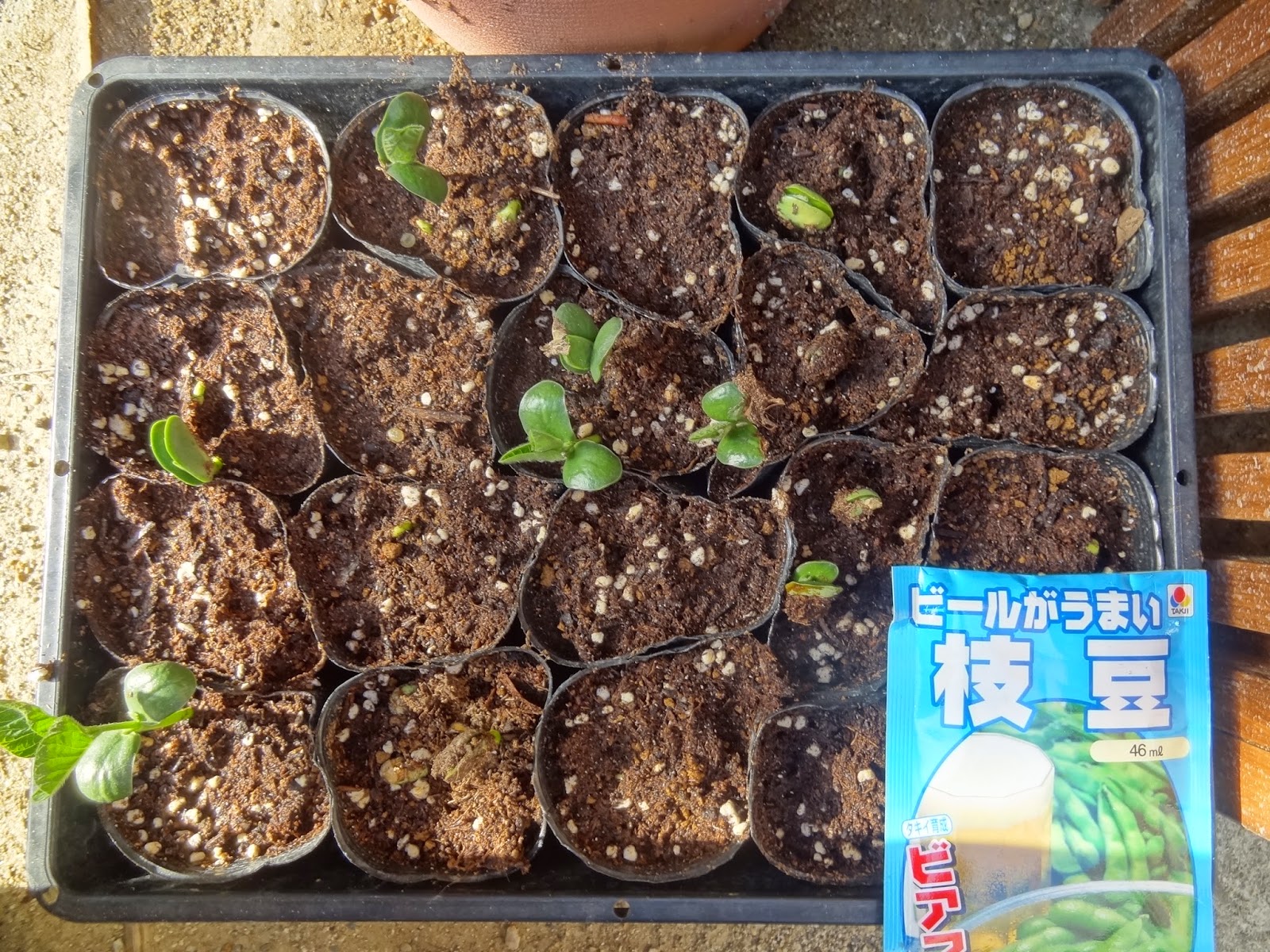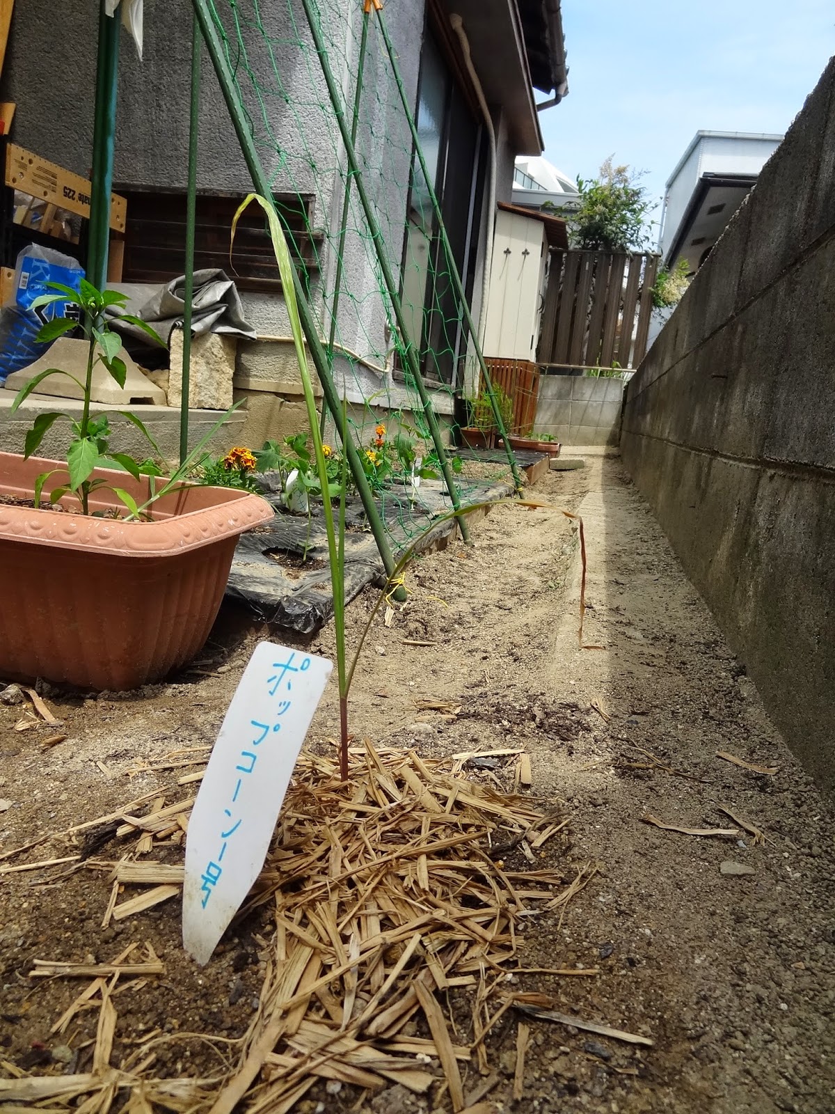 キュウリ・枝豆(ビール専用です)・マリーゴールド・「ポップコーン」と書かれたとうもろこし。