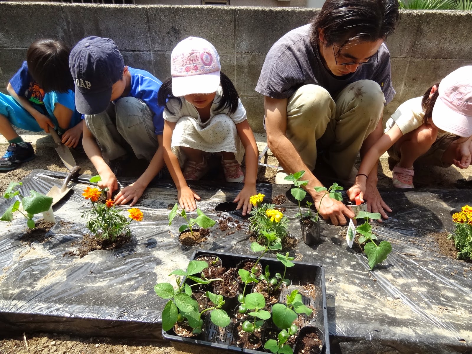 そして、小1の女の子が団欒長屋の畑にと、ミニひまわりと朝顔の種をプレゼントしてくれたので、それもみんなで鉢に植えました。