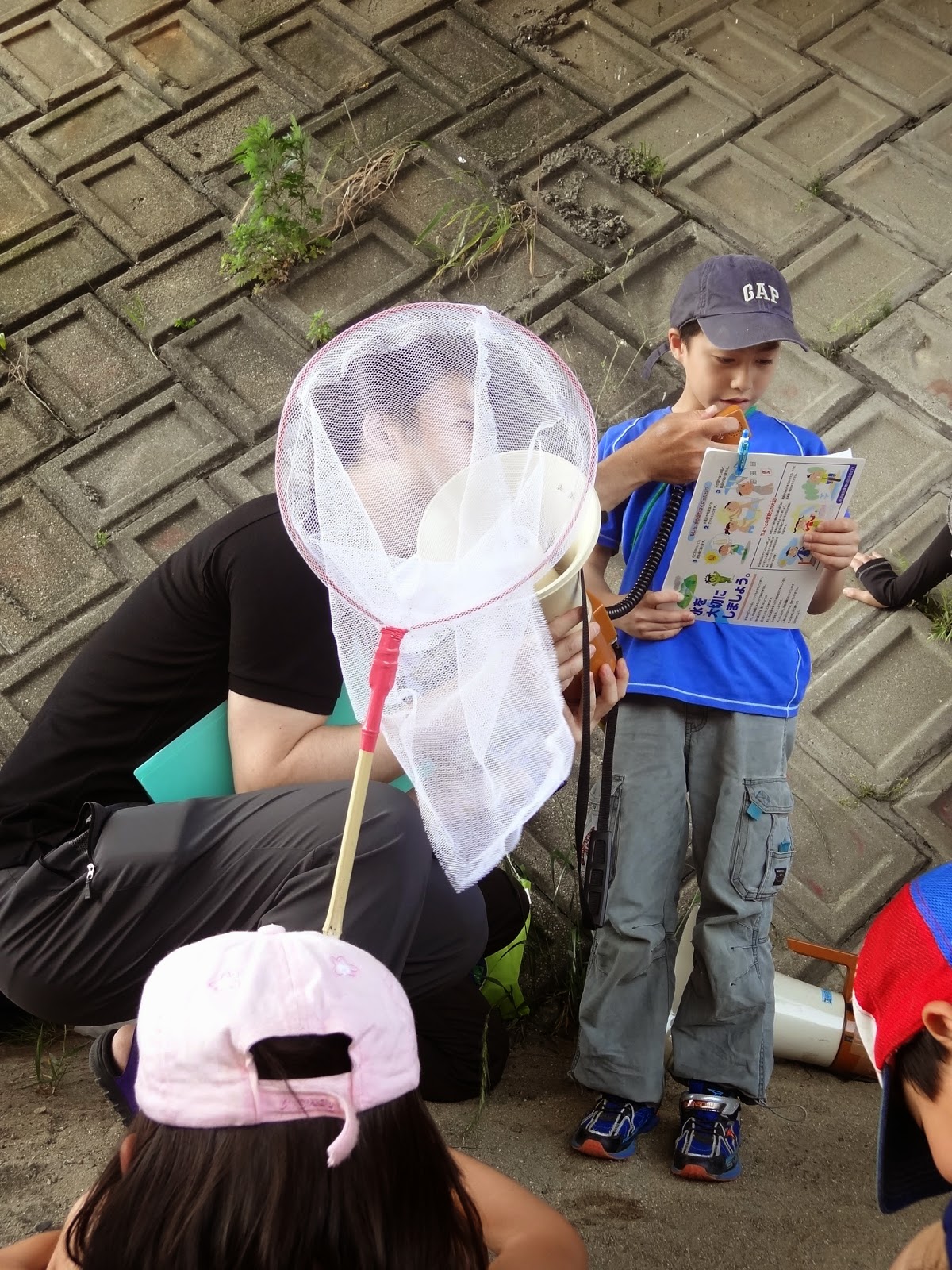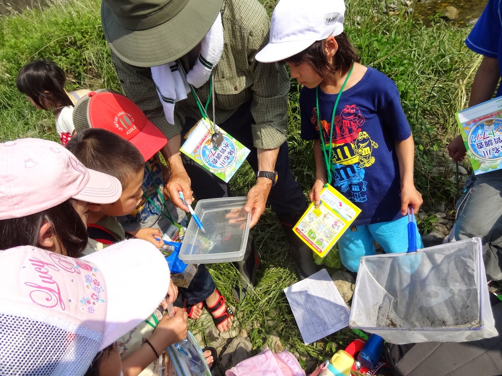 先生に教わりながら、次々にエビやらシジミやらヤゴやらアメンボやら採っては、得意そうに駆け寄ってくる子どもたち。
