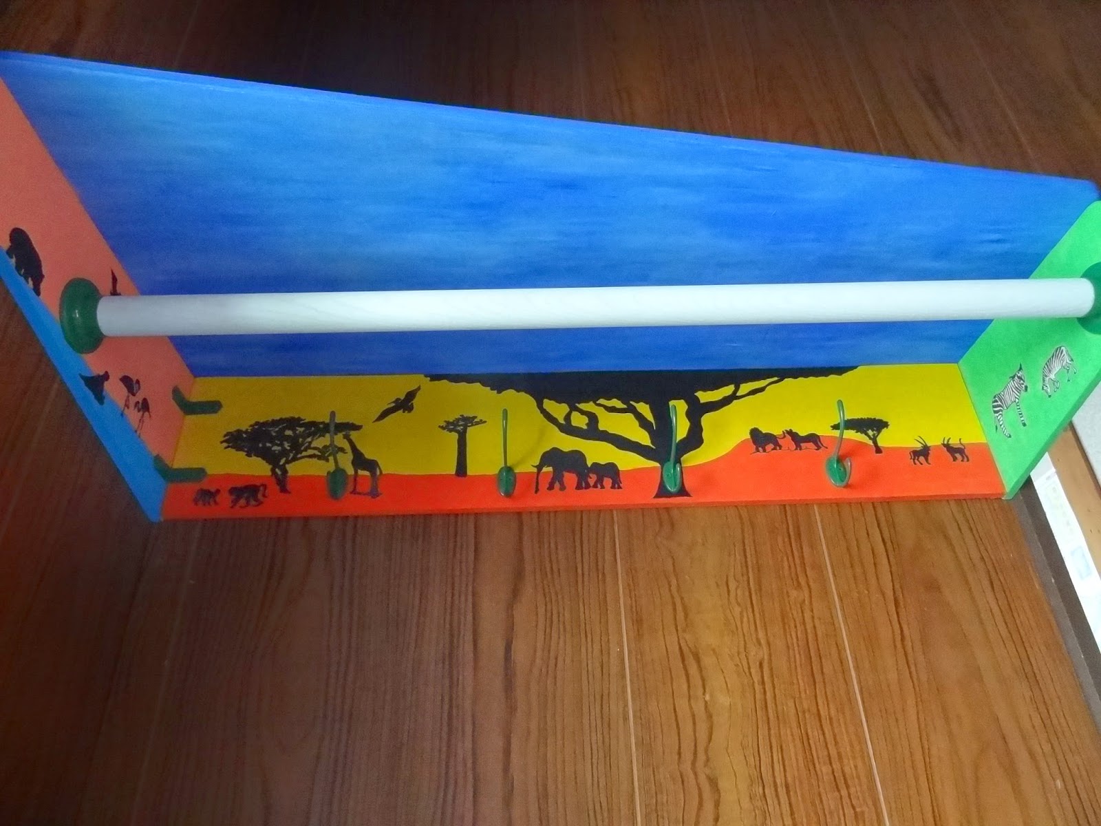 昨年の冬、ナカムラさんに作ってもらって木目がそのままだったハンガー掛けを、カラフルに塗りました。